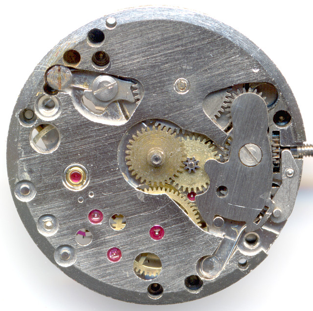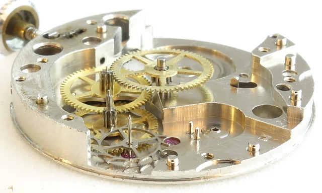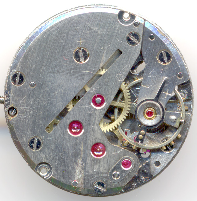 All important bearings, except minute- and mainspring barrel bearing contain rubies and are a little larger, than usual. On the movement bridge, there are even jewels for the minute wheel bearing and a cap jewel for the excapement wheel bearing. In total you get 17 jewels, which is pretty high for a manual wind movement of the 1950ies.