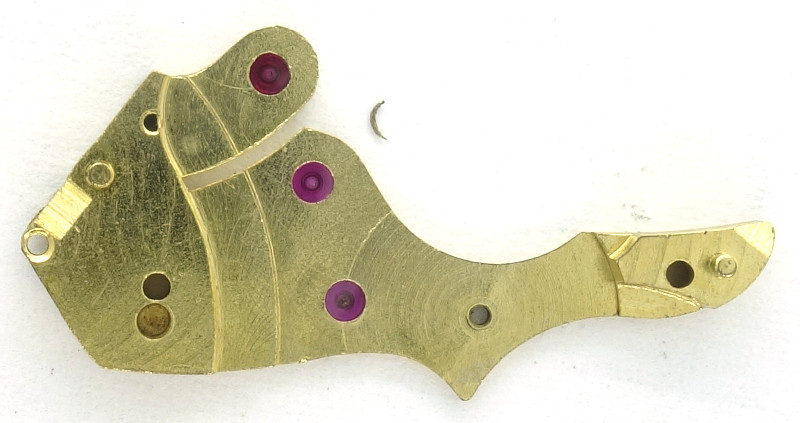 On most versions, an own cock is used for the escape wheel bearing, but on the version shown here, the movement side escape wheel bearing is part of the gear train bridge.