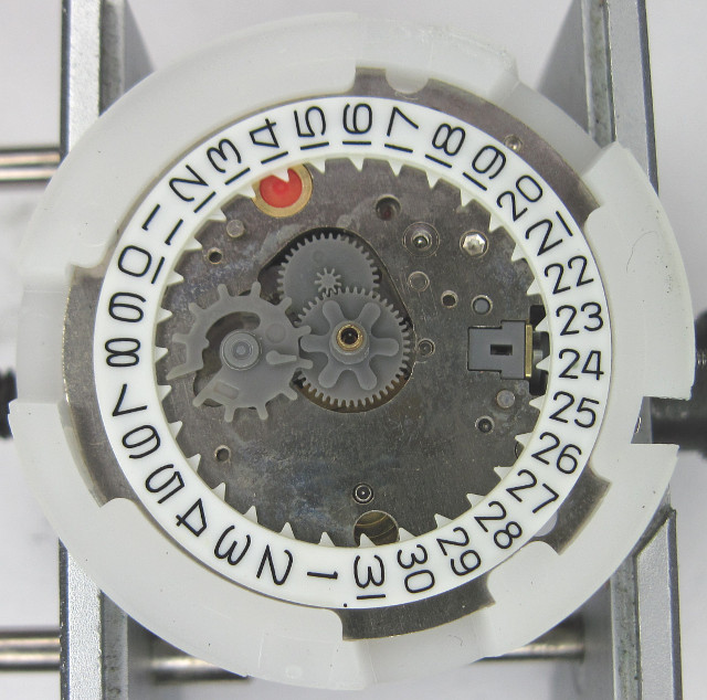 The weekday disc is, as the date ring, made of plastic and secured by a snap ring.