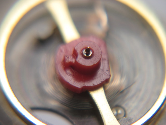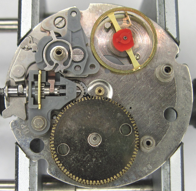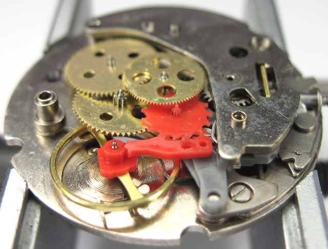 Unfortunately on this movement, just those parts which are most crucial for precision and longevinty, excapement wheel, lever and balance finger are made of red plastic, which either turns brittle or softens, like on the specimen shown here. This is especially bad, since the axles are also made of plastic, so a rather short lifetime of that movement is ensured.