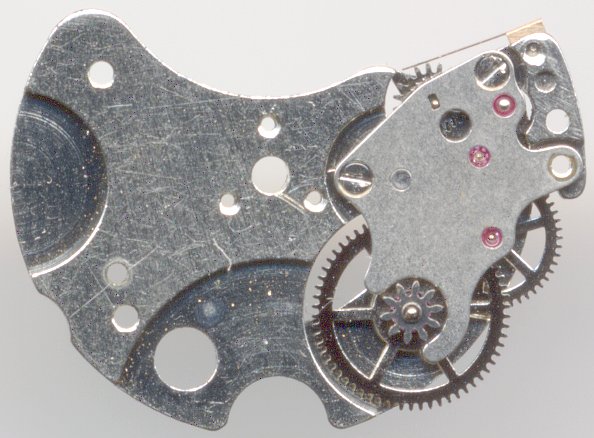 Weekday (left) and day (right) are indicated by two hands. Both indicators advance slowly over many hours, but also have got two(!) different quickset mechanisms at the same time: First by pressing the pushers at “8” (weekday) or “4” (day), second by turning the time back and forth a few hours, the plasic disc with its flexible finger ensures, that the date is not set back when the time is set back, thus allowing the date to be set forward only by turning the hands back and forth. Interestingly, the weekday on contrast, can be set back by turning the time back.