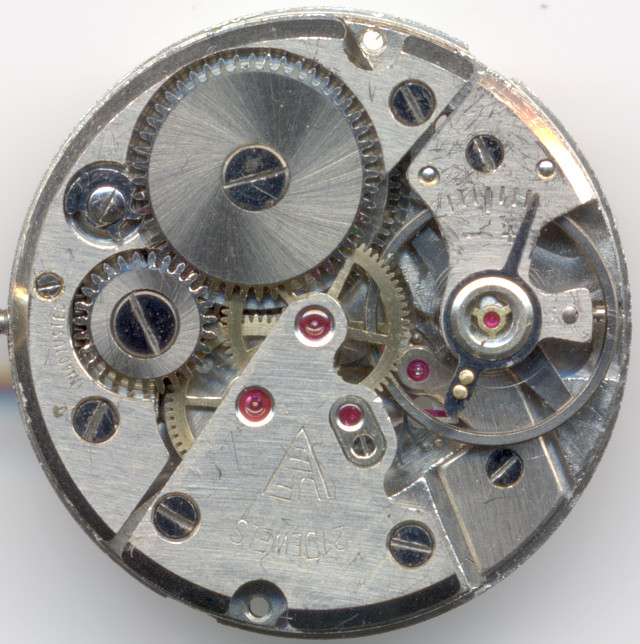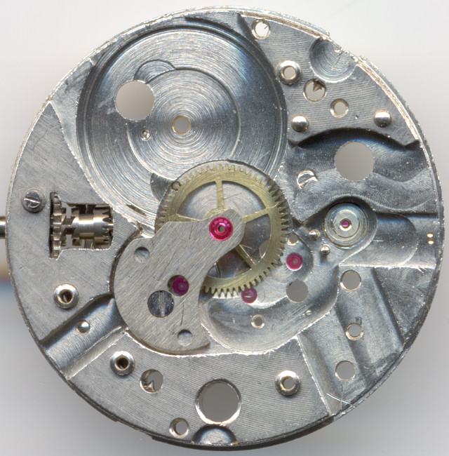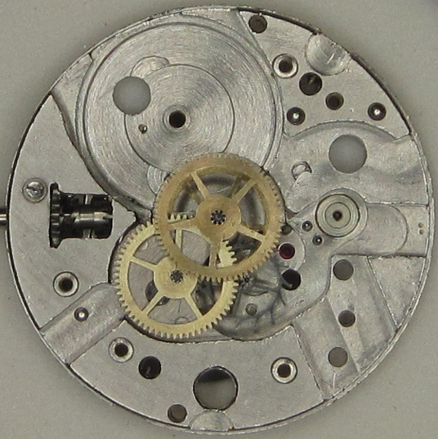 With its directly driven center second and the also directly driven center minute wheel, the gear train is very common for the 1950ies.