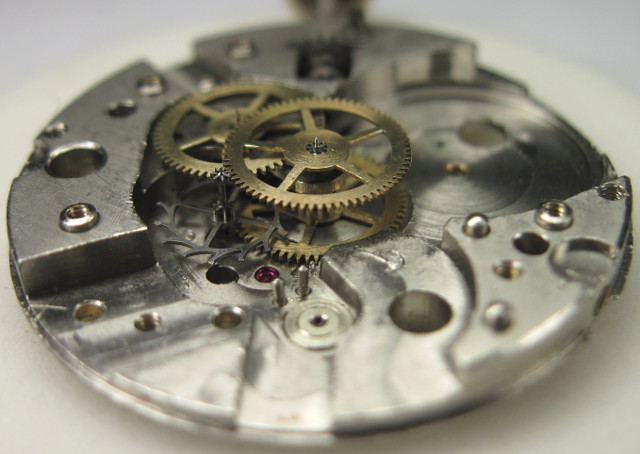 On the base plate, you recognize the conservative and often used construction with central minute wheel. Here, on the Uwersi 57/10 it is even ruby-beared.